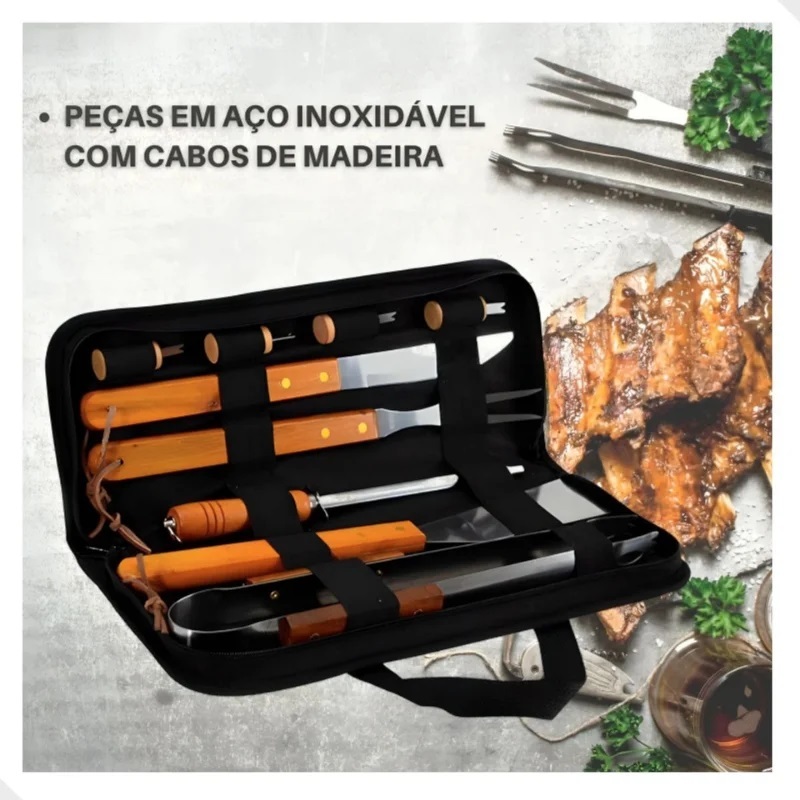 Kit Churrasco Profissional em Aço Inox com 10 Peças Facas Pegador Garfo Espátula e Estojo Cabo em Madeira Kit Churrasque