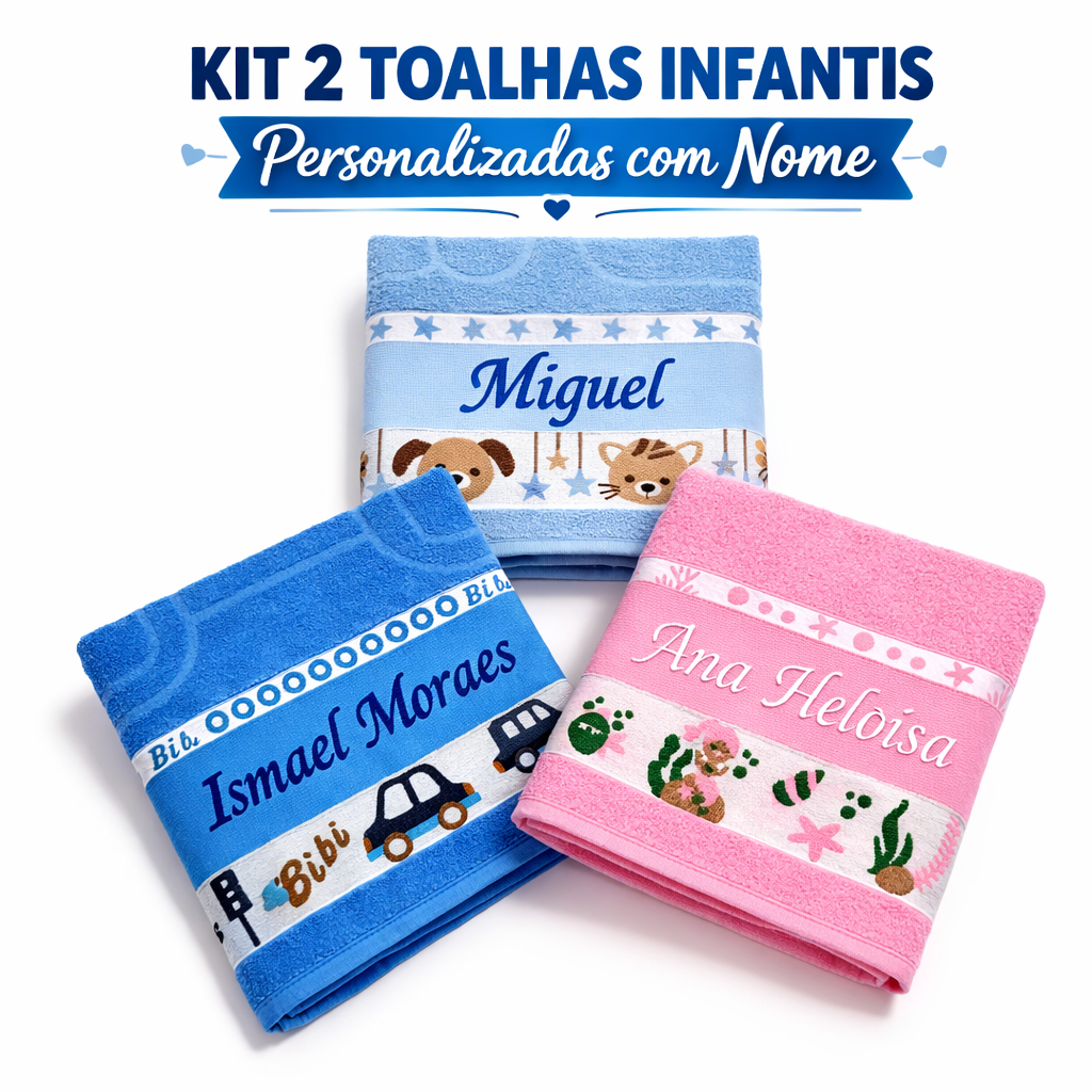KIT 2 Toalhas de Banho Infantil Para Creche Escola Presente Personalizada Com Nome Bordado