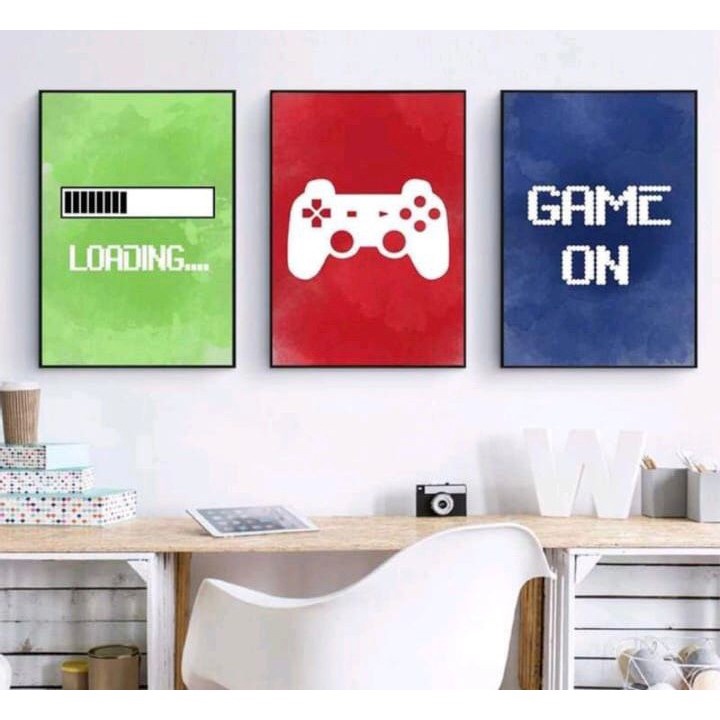 Kit Quadros Decorativos Mosaico 3 Peças Trio Quarto Gamer Jogo Controle Frase Loading Game On Presente Abstrato Arte Desenho