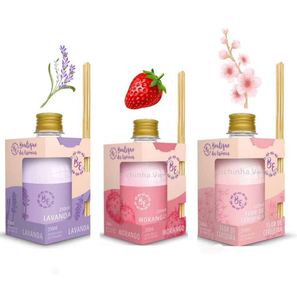 Kit 3 Aromatizadores 1 Lavanda 1 Morango 1 Flor cerejeira 250ml cada