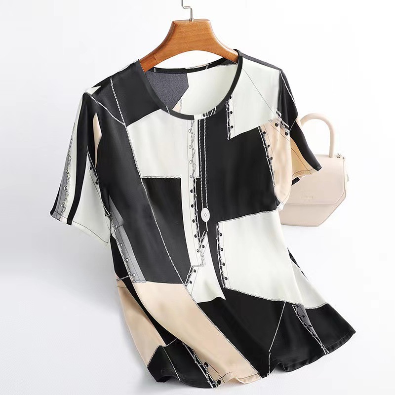 Camiseta Feminina Casual De Chiffon Gola Redonda Xadrez Com Mangas Curtas Para Mulheres/Primavera/Verão