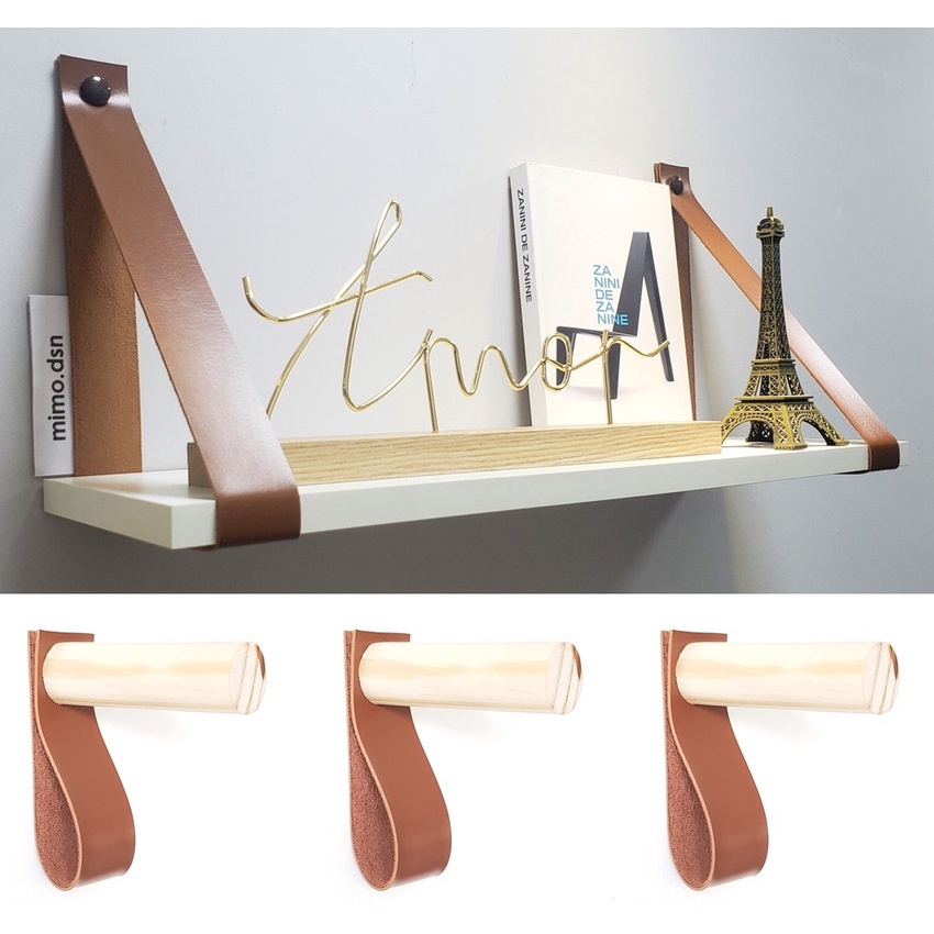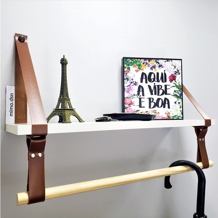 Par de Alças reforçadas com 4cm de largura feito em Material Sintético com Textura de Couro + Prateleira + 3 Cabideiros de parede - 1D