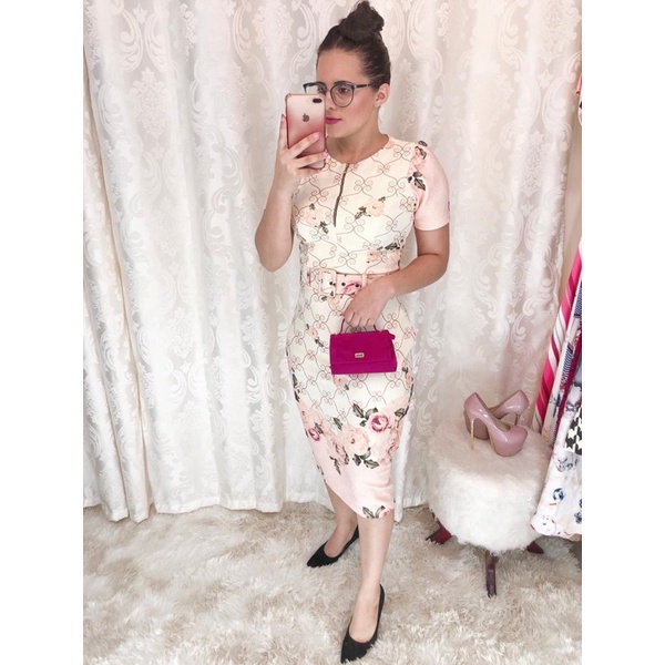 vestido mídi na malha montaria ou neoprene, como na foto, acompanha cinto.