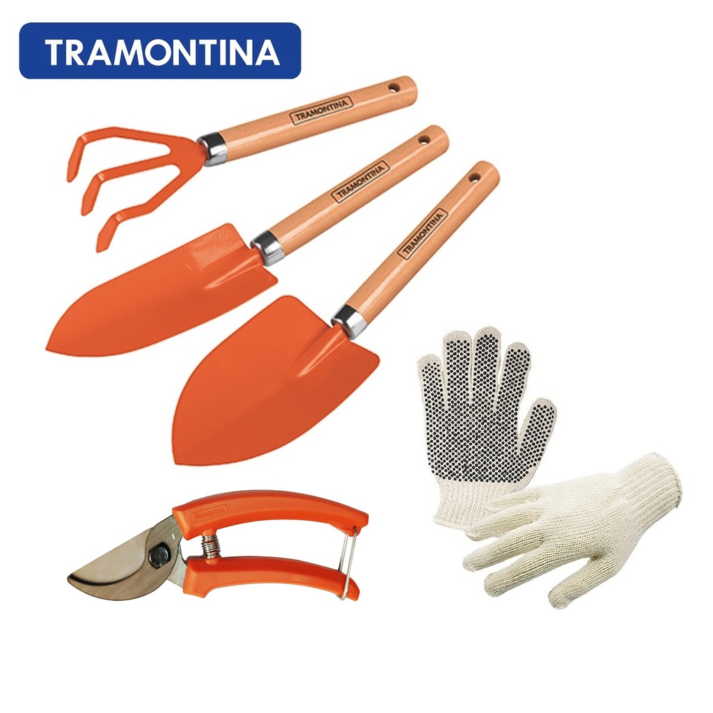 Kit Jardinagem 4 Peças Tramontina (Ancinho, Pazinha Larga, Pazinha Estreita, Tesoura de Podar Galhos + Luva de Brinde)