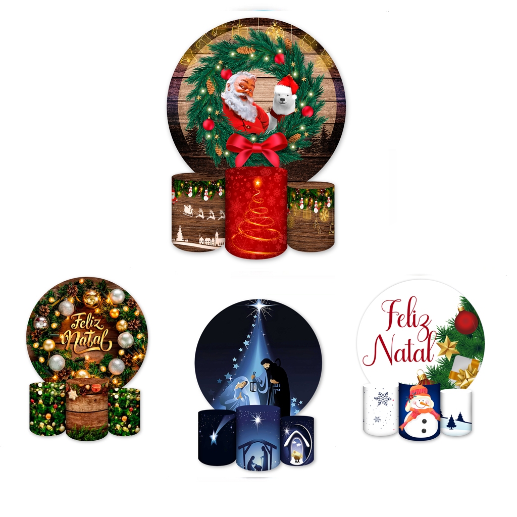 Kit Painel Redondo + Capas de Cilindro Sublimados Para Festa Tema Natal