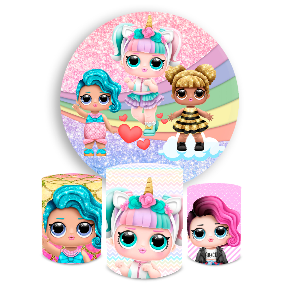 Kit Decorativo infantil Boneca Lol Painel Redondo + Trio Capa Cilindros Veste Fácil