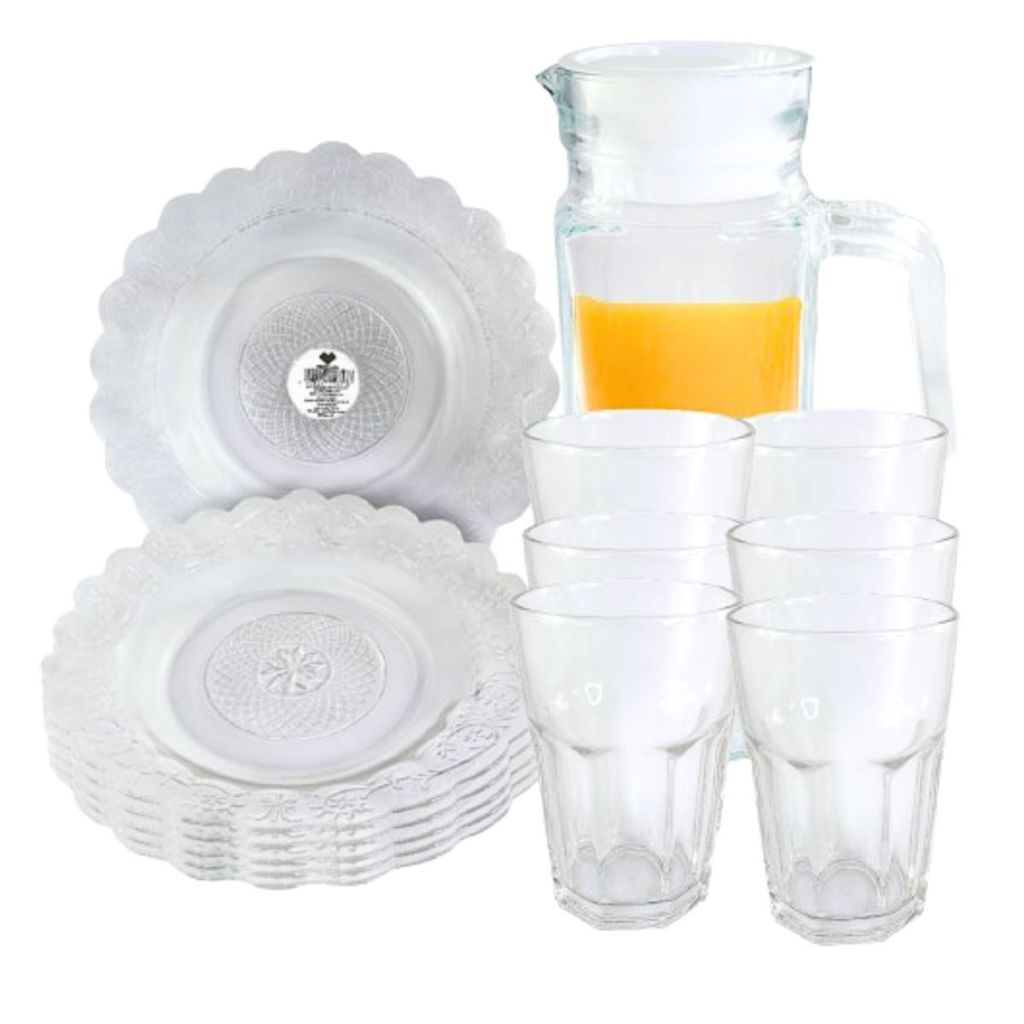 Kit 1 Jarra Vidro 1L Vidro c/ Tampa + 6 Pratos Vidro Estrela Egípcio + 6 Copos Vidro 350ml p/ Almoço Suco Vitamina Shake