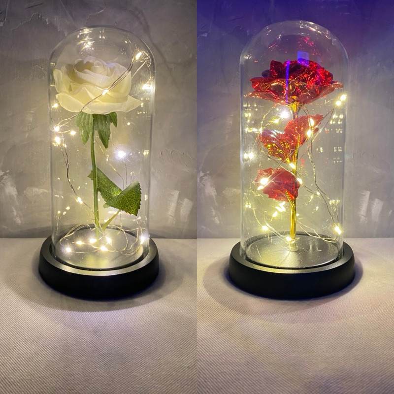 Luminária Cúpula 20 Cm A Bela E A Fera/O Pequeno Príncipe Com A Rosa Encantada Aveludada Com Cordão De Led