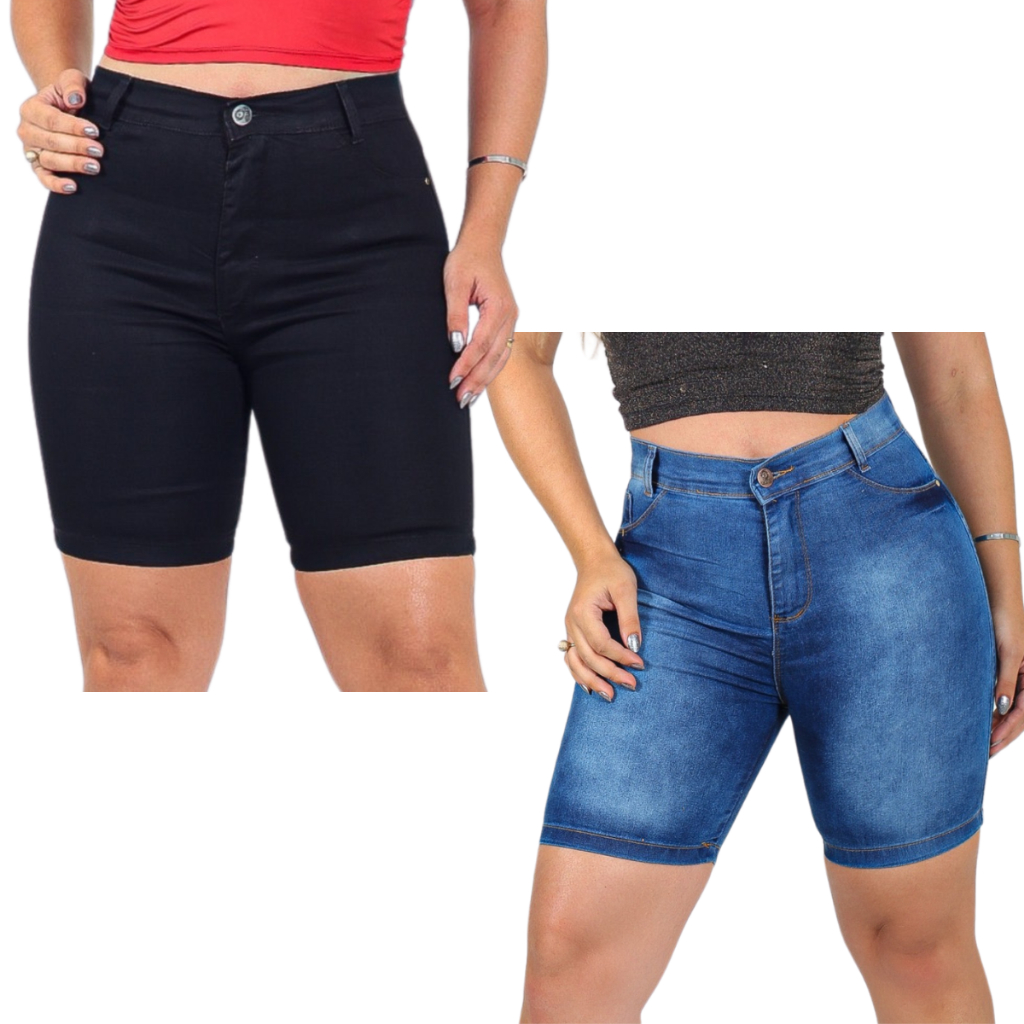 Kit 2 Bermudas Jeans Feminina Meia Coxa Cintura Alta Lycra Modelagem Levanta Bumbum