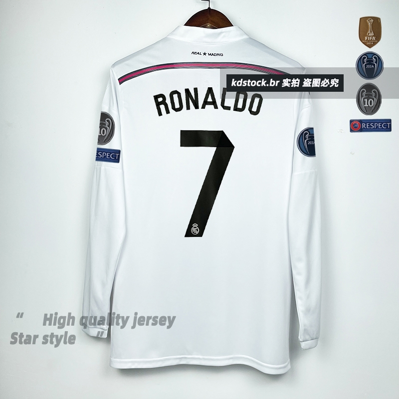 14-15 Real Madrid Home Camisa de Manga Longa de Futebol Jersey No. 7 Ronaldo Retro Football Jersey Liga Européia do Campeonato Europeu de Futebol Jersey Personalização