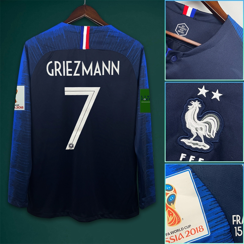Campeonato da Copa do Mundo de 2018 França Jersey de Manga Longa Jersey de Futebol Retro No. 7 GRIEZMANN Jersey No. 10 MBAPPÉ Personalização da Jersey de Futebol