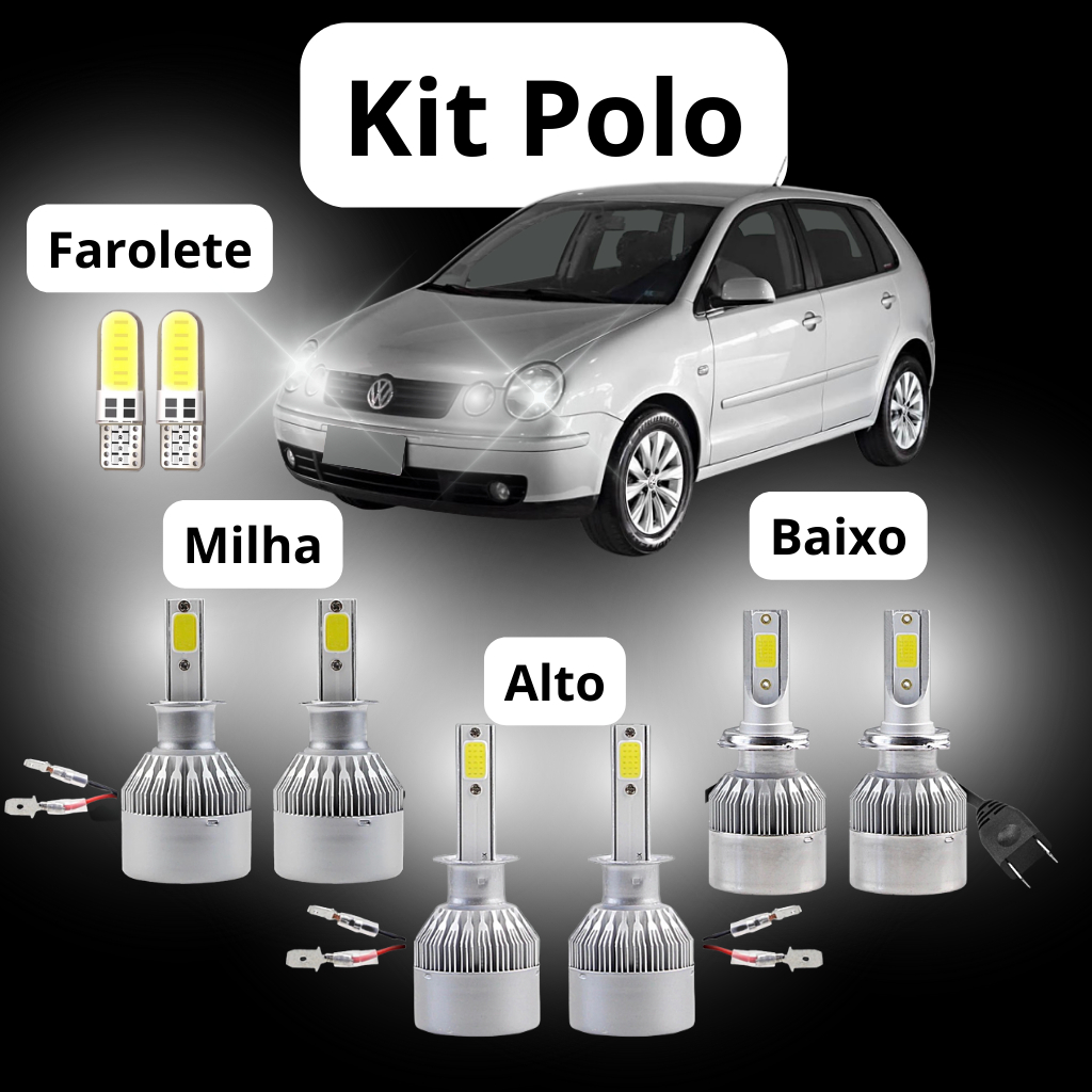 KIT (Faról: Baixo/ Alto/ Milha+ Farolete) Volkswagen Polo 2003 2004 2005 2006 Lâmpada Super Led Branca Ultra Led Xenon contém: H1- H7- H3 - T10