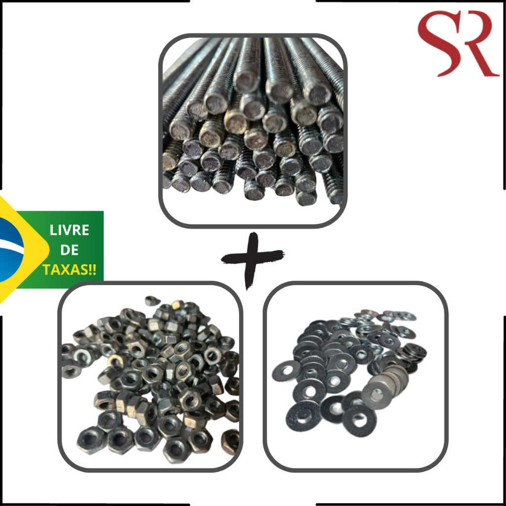 KIT 10 Barra Roscada - Barra Rosqueada 3/16" , 1/4" , 5/16" , 3/8" , 1/2" - 1 Metro + 25 Porca e + 25 Arruela Zincada