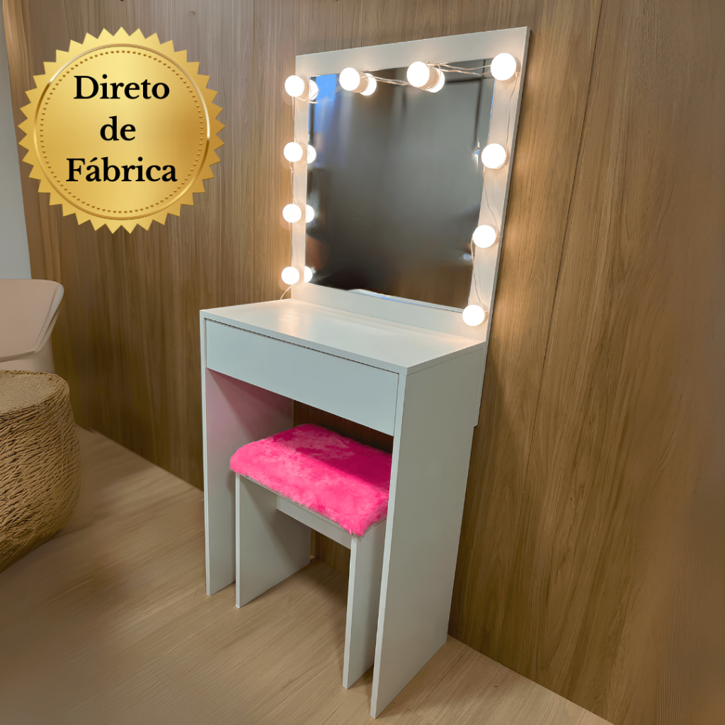 Penteadeira com Banco Rosa Led e Espelho 50cm x 50cm material em 100%MDF