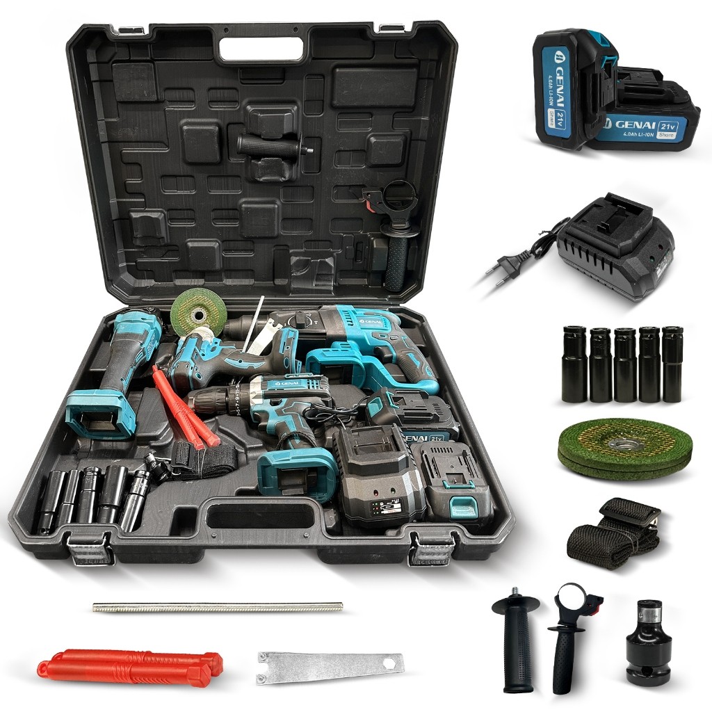 21V Kit Martelete Parafusadeira Chave De Impacto Esmerilhadeira 4 Em 1 Com Acessórios E Caixas