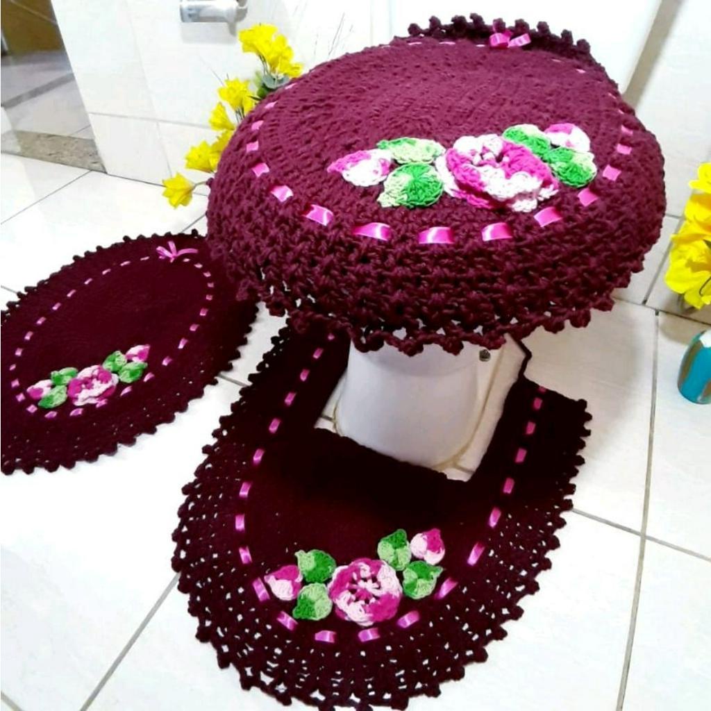 Jogo de Banheiro Bordado Com Flor Vinho Modelo Novo - Barbante Grosso - Ponto Firme - Artesanal - Feito a Mão - 3 Peças