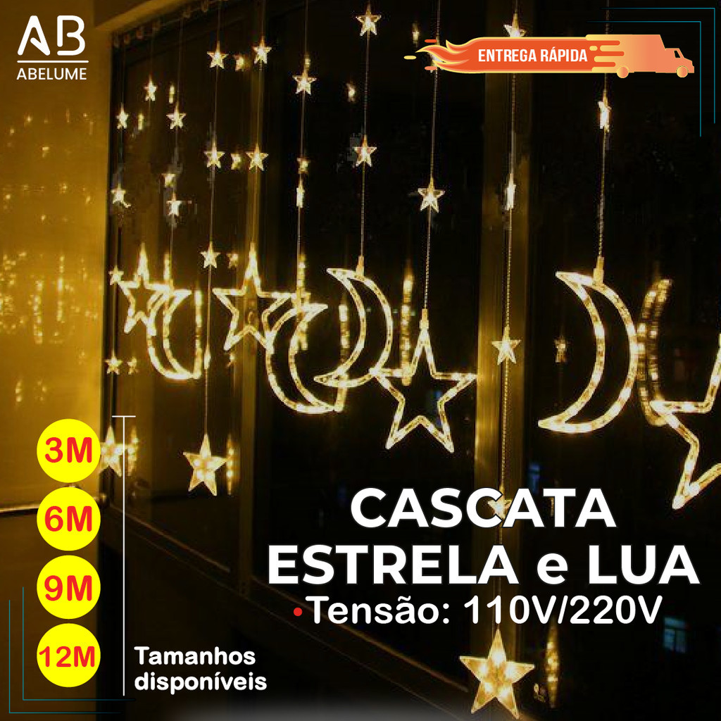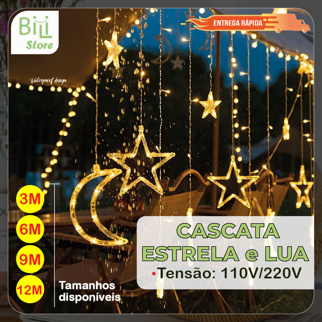 12 Metros Pisca Pisca Fio de Fada LED c/ Cascata de luzes Estrela e Lua 9W Cortina com 8 modos de luz Branco Quente 110V ou 220V