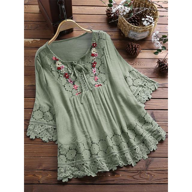 Camisa feminina de linho de algodão tipo solto verão plus size gola V renda renda splicing temperamento