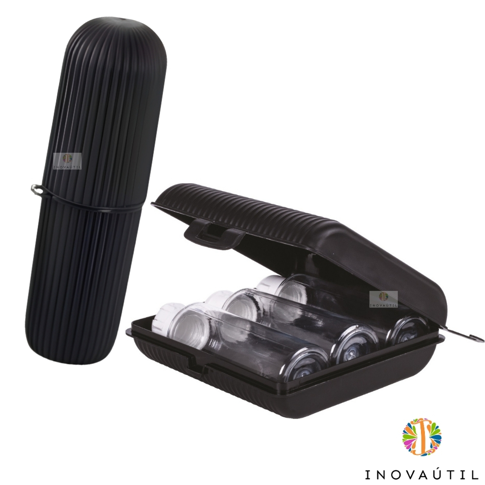 Kit Viagem Porta Escova e Creme Dental + Saboneteira com Tampa + Box com 3 Frascos 100ml Porta Shampoo, Condicionador, Sabonete líquido, Hidratante e Álcool em Gel