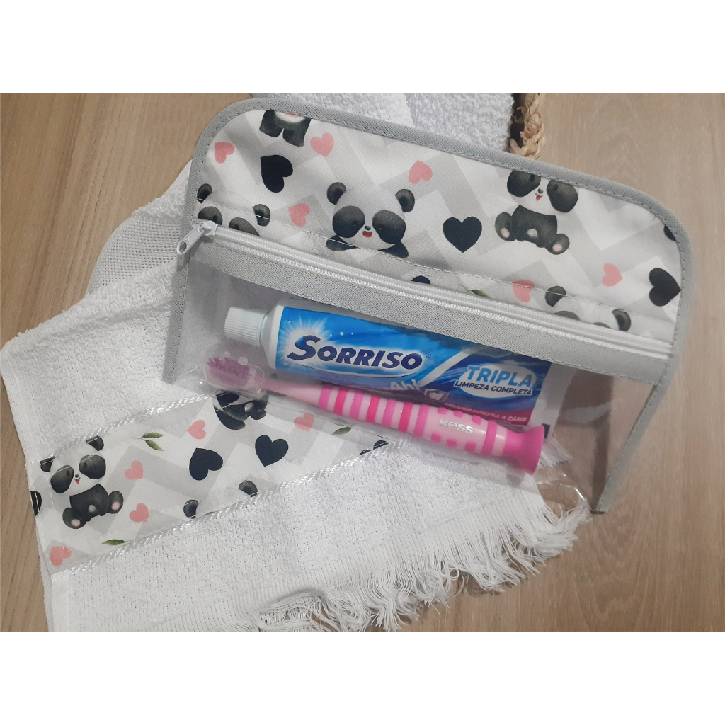 kit higiene bucal com toalhinha porta escova de dentes e creme dental
