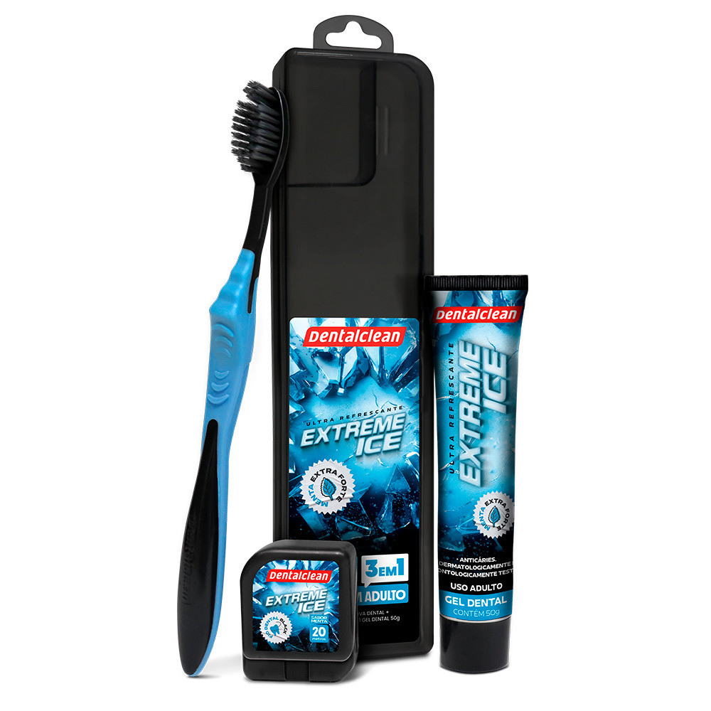 Kit Viagem Porta Escova com Escova de Dente Pasta e Fio Dental Extreme Ice Estojo Dentalclean