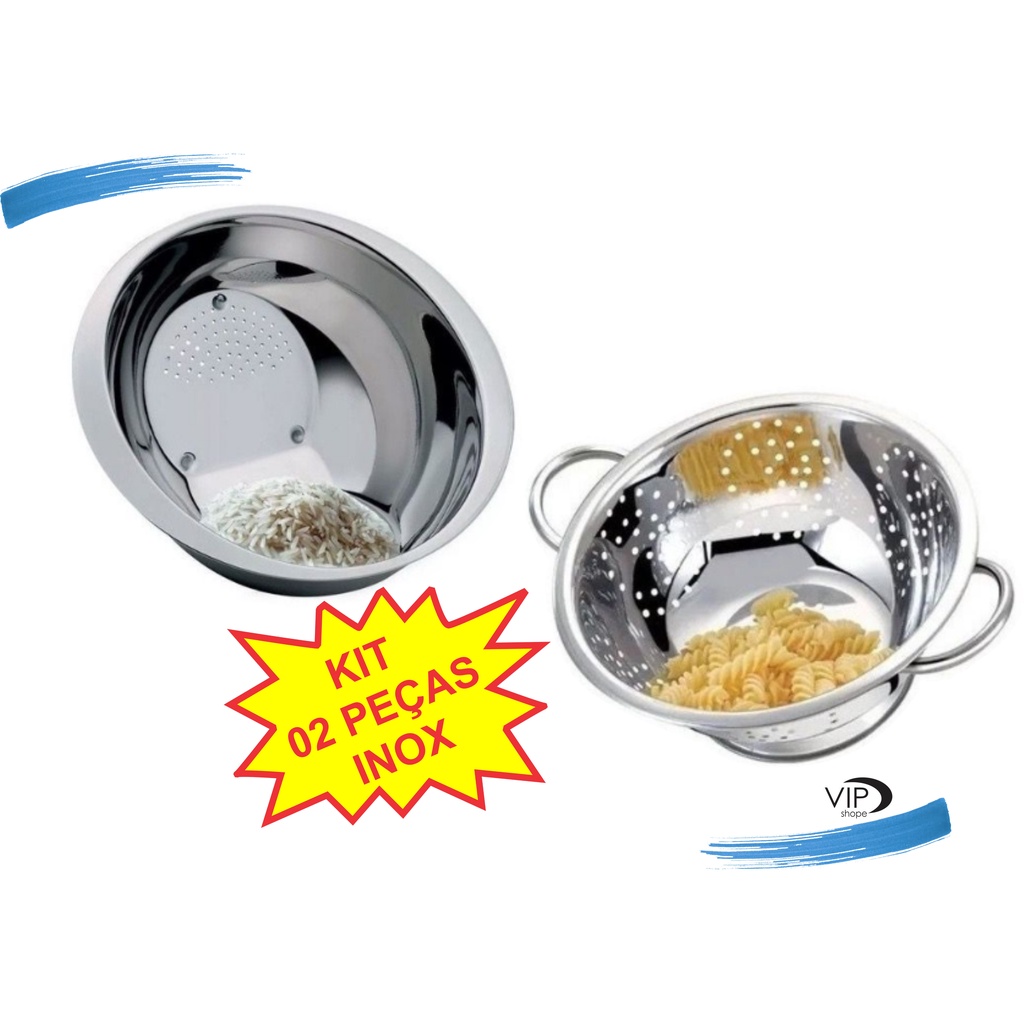 Kit Conjunto Escorredor De Massa e Macarrão com Alça + Lavador de Arroz em Inox