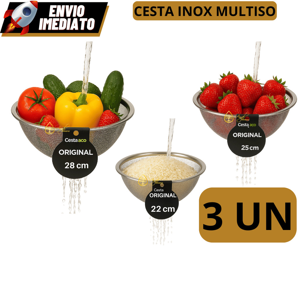 Kit 3 Cestas em Inox 22cm 25cm 28cm Escorredor Multiuso de Macarrão Legumes Arroz Fruteira