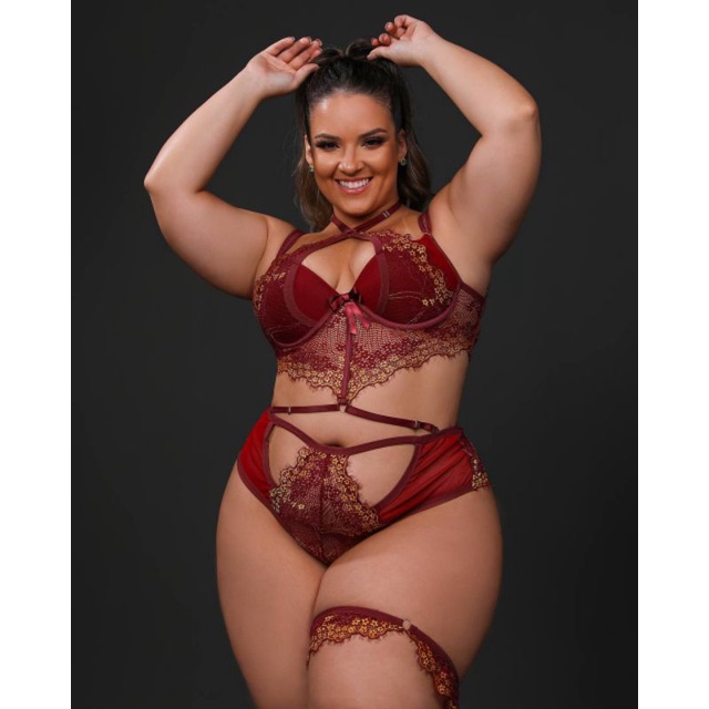 Conjunto Plus Size Lingerie Sexy em Renda com Cinta Liga