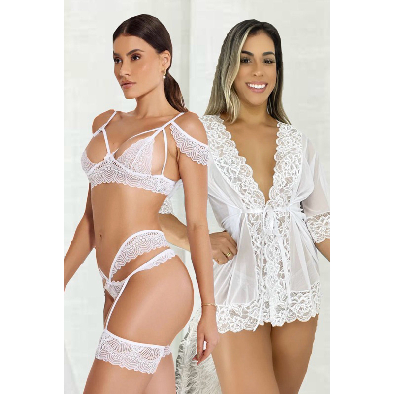 KIT COM CONJUNTO LINGERIE CINTA LIGA RENDA E ROBE TULE SENSUAL P M G E GG