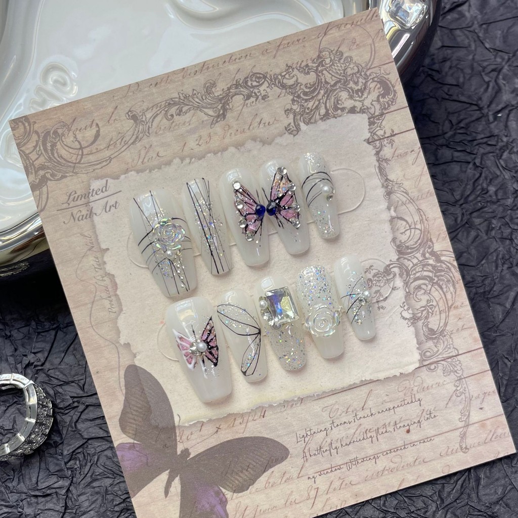 [HANDMADE] Prego artificial colorido pintados à mão meia-borboleta Dreamy Lines Pérolas Fototerapia Unhas Reutilizáveis e Removíveis