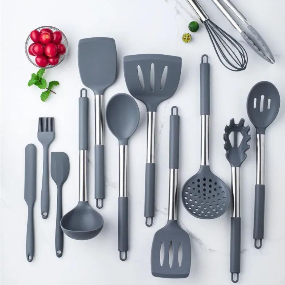 Jogo Kit Com 12 Peças Utensílios De Cozinha Colheres Espatulas Pegador Silicone Copo Suporte