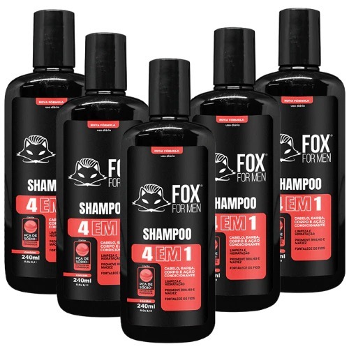 Kit 5x Shampoo 4 em 1 Fox For Men 240ml – Barba, Cabelo, Corpo e Pós-Barba Masculino Profissional