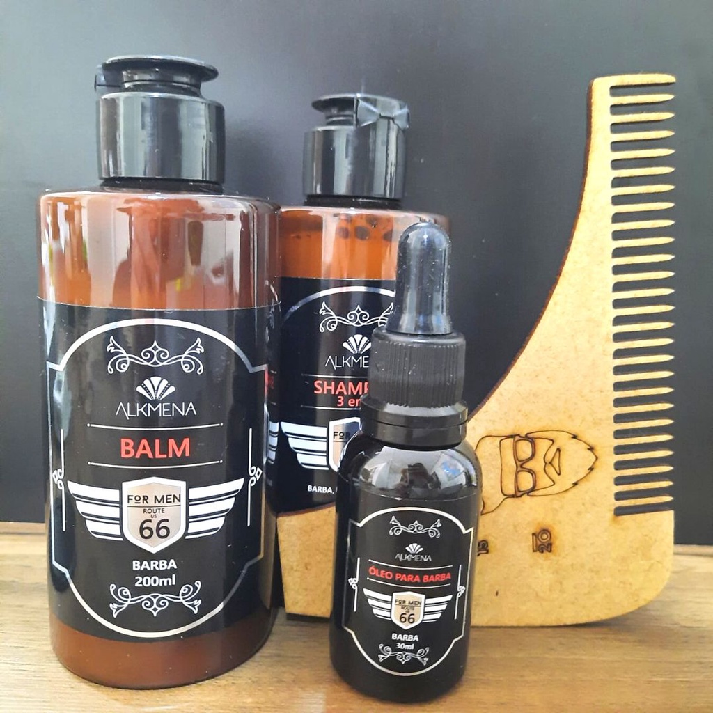 Kit Balm, Óleo para Barba, Shampoo 3x1 e Pente de Madeira para barba com medição para ajuste de corte For Men - Alkmena