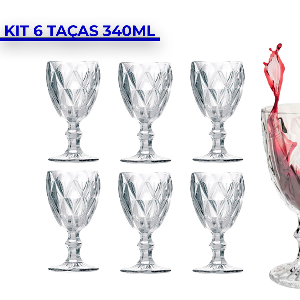 Conjunto 6 Taças De Vidro 320ml Diamond Transparente Vinho Água Suco Champagne