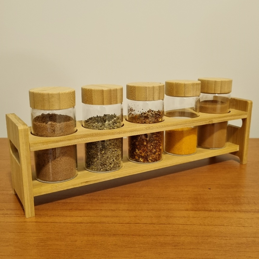 Kit 5 Potes De Vidro Porta Tempero Condimentos 120ml Com Suporte E Tampa Em Bambu