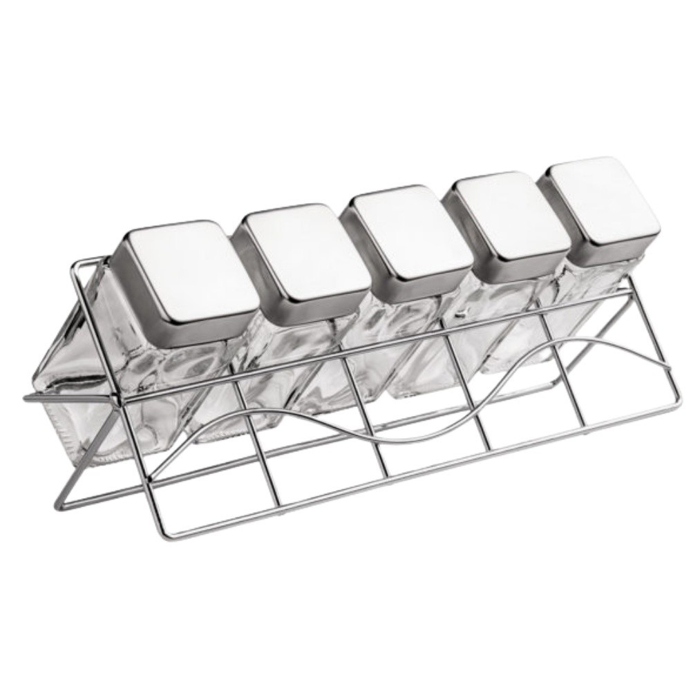 Kit Porta Temperos Com 5 Frascos Quadrado De Vidro Mais 1 Suporte Cromado Euro Home