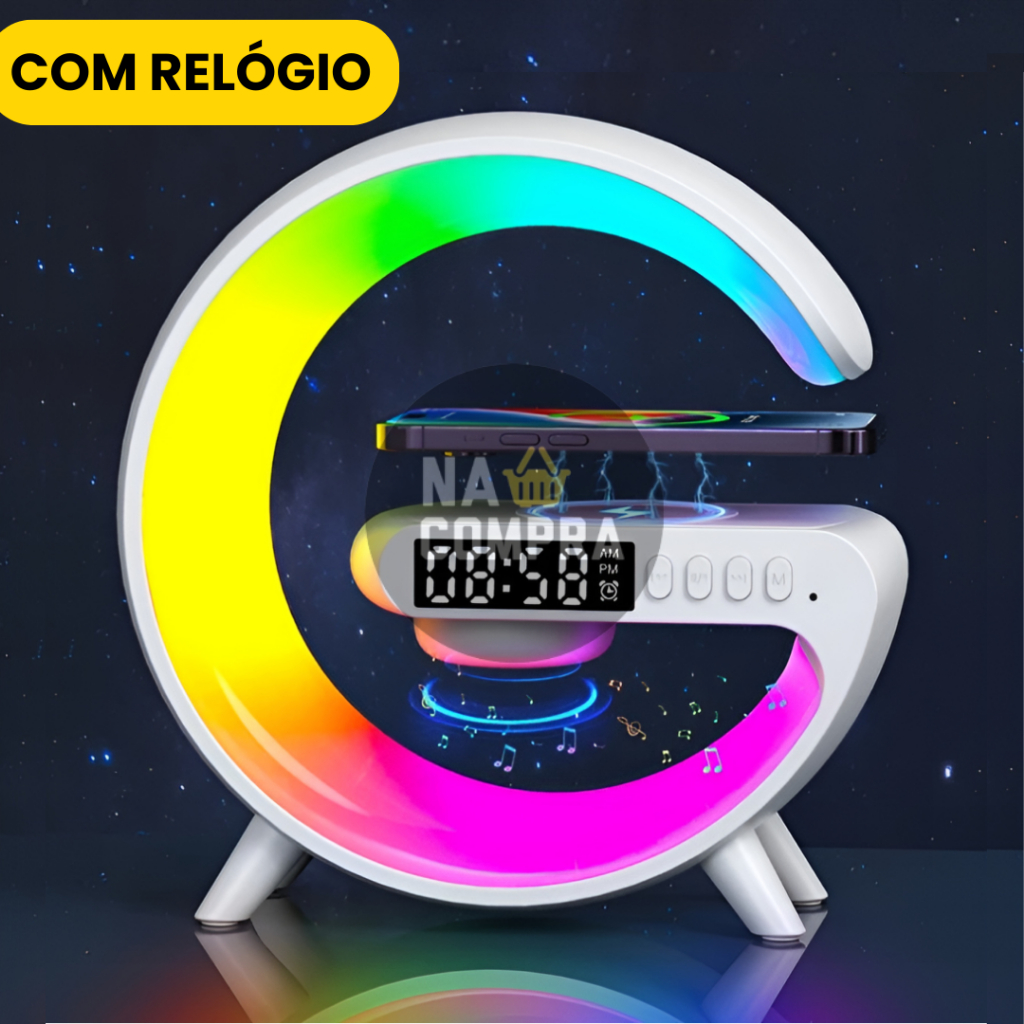 Caixa de Som Com Relógio G-Speaker Luminária Bluetooth Inteligente Carregador Sem Fio Led Luz Rgb Caxinha
