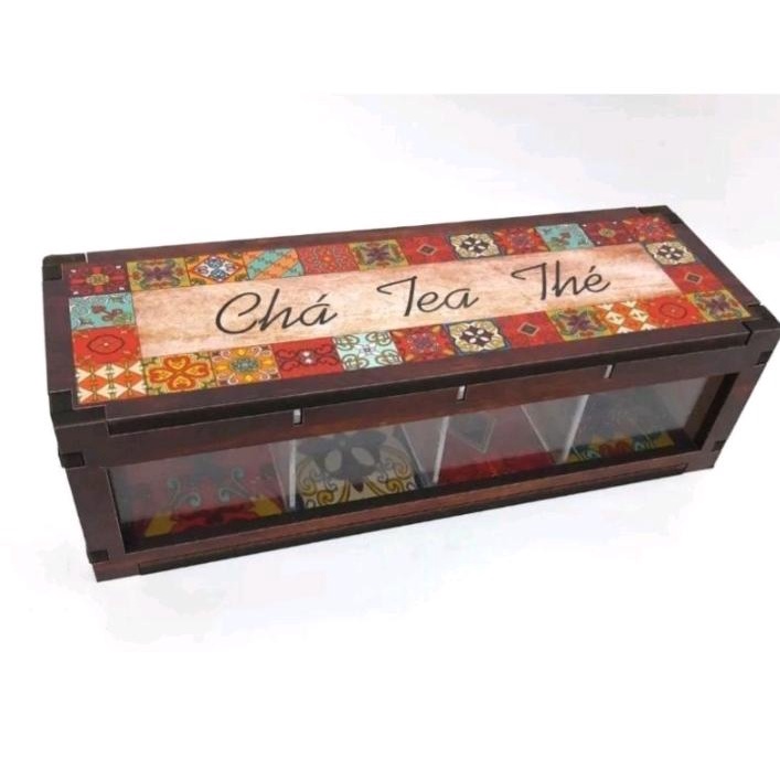 Porta Chá Caixa 4 Divisórias Visor Duplo Mdf Adesivado 25cm