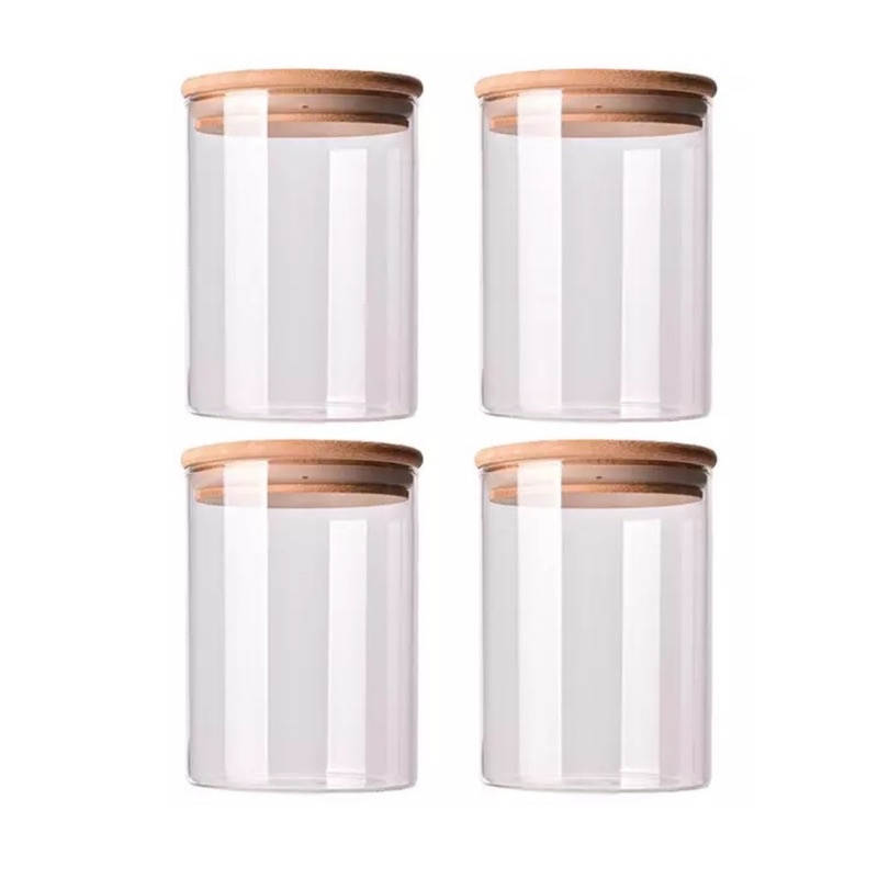 Kit Conjunto 4 Potes De Vidro hermético 450ml Tampa de Bambu Condiments