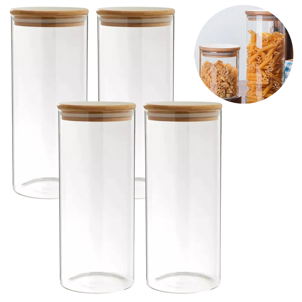 Kit 4 Potes de Vidro 1800ml com Tampa de Bambu Hermético Mantimentos Condimentos Empilhaveis