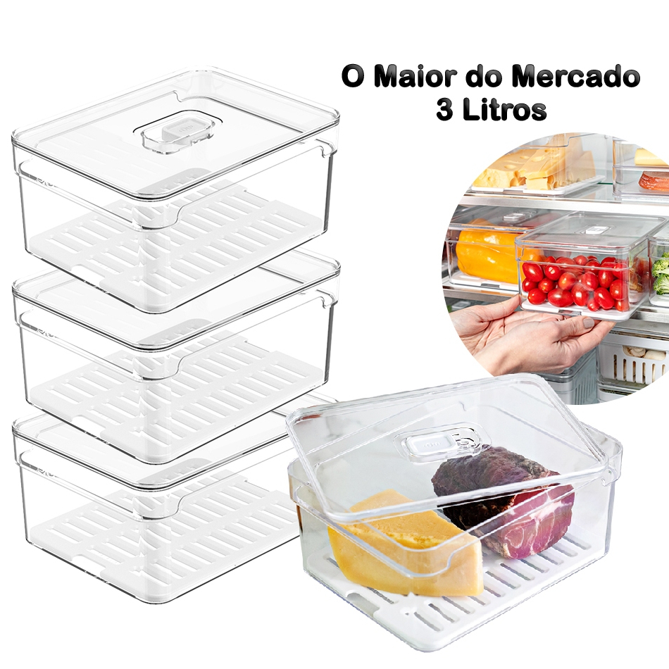 Kit 4 Organizador de Geladeira 3 Litros Bandeja Drenagem Com Tampa Multiuso Alimentos Verduras e Vegetais