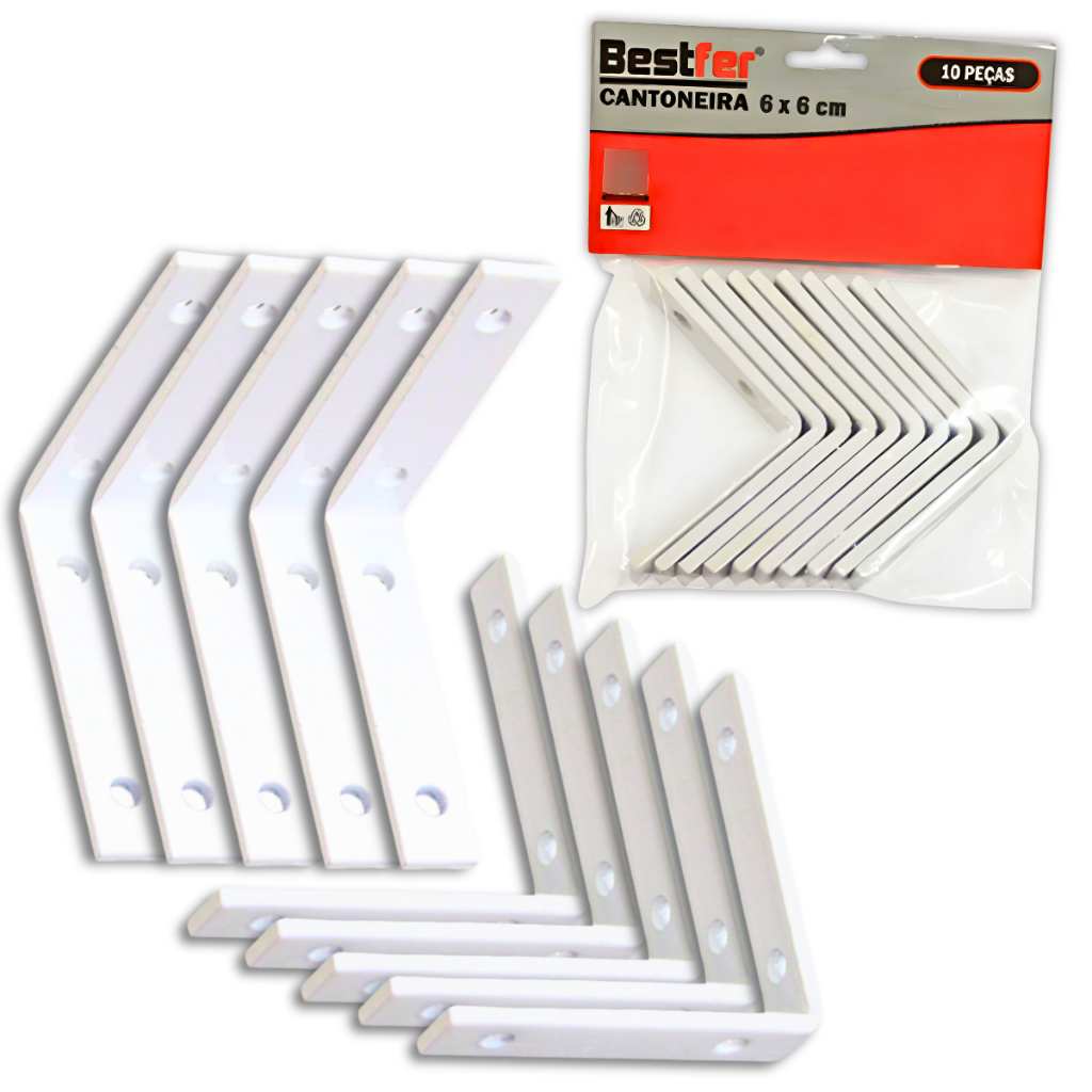 Cantoneiras de Metal Kit Com 10 Peças 4 Furos 6 cm x 6 Cm Bestfer BFH1693 Branca
