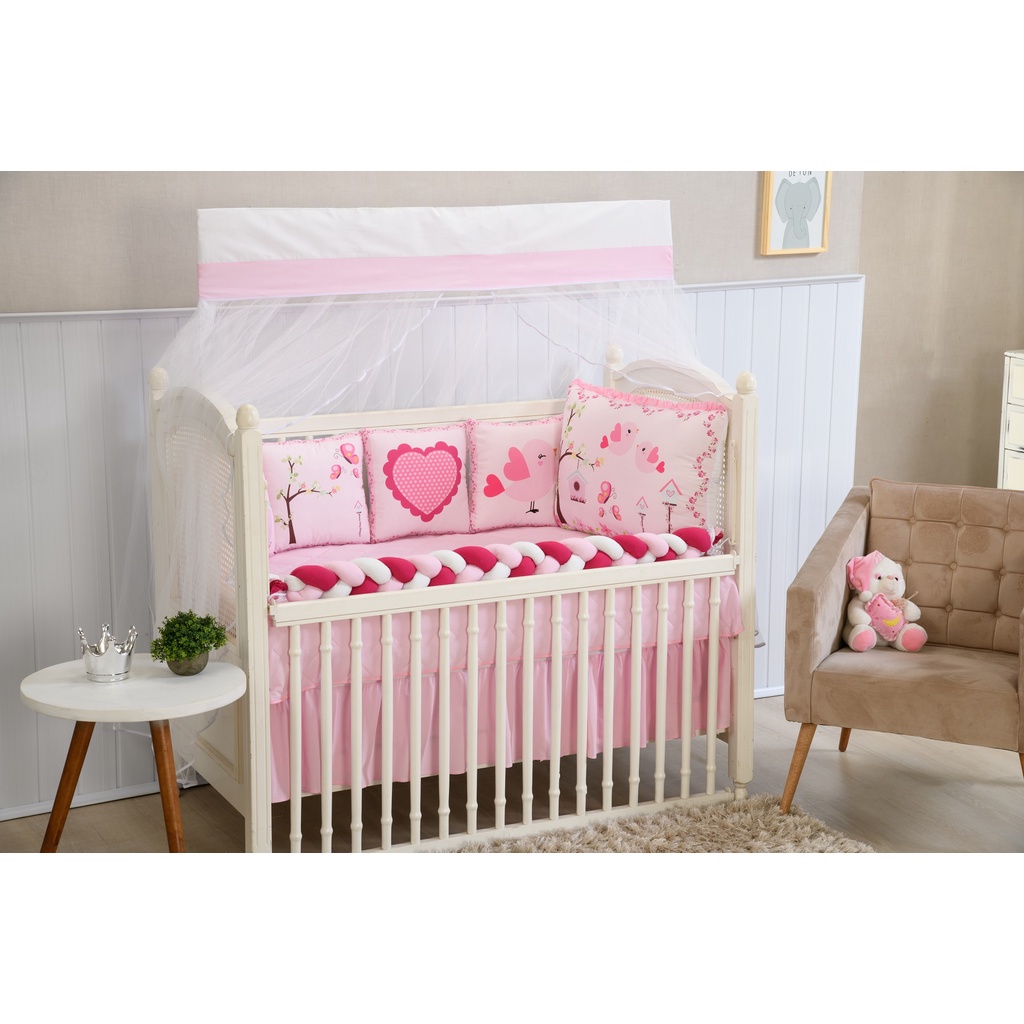 Kit Protetor Berço Completo 10 Peças + Saia Brinde Padrão Nacional e Americano Modelo Cristal Menina Rosa - Promoção