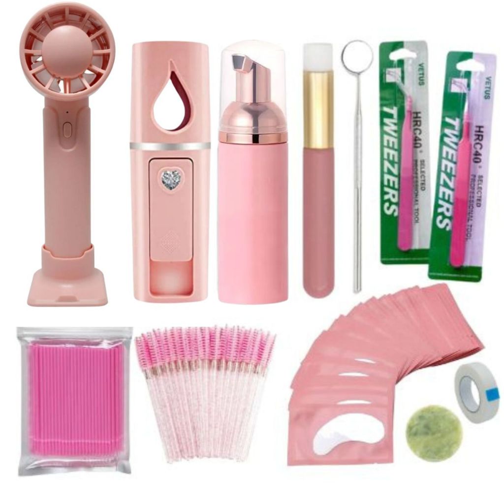 Kit Completo Iniciante Treino Extensão e Alongamento Cílios Shampoo Loveyes Ventilador Nano Spray Pinça Vetus Pisseta Pump Porta Micropore