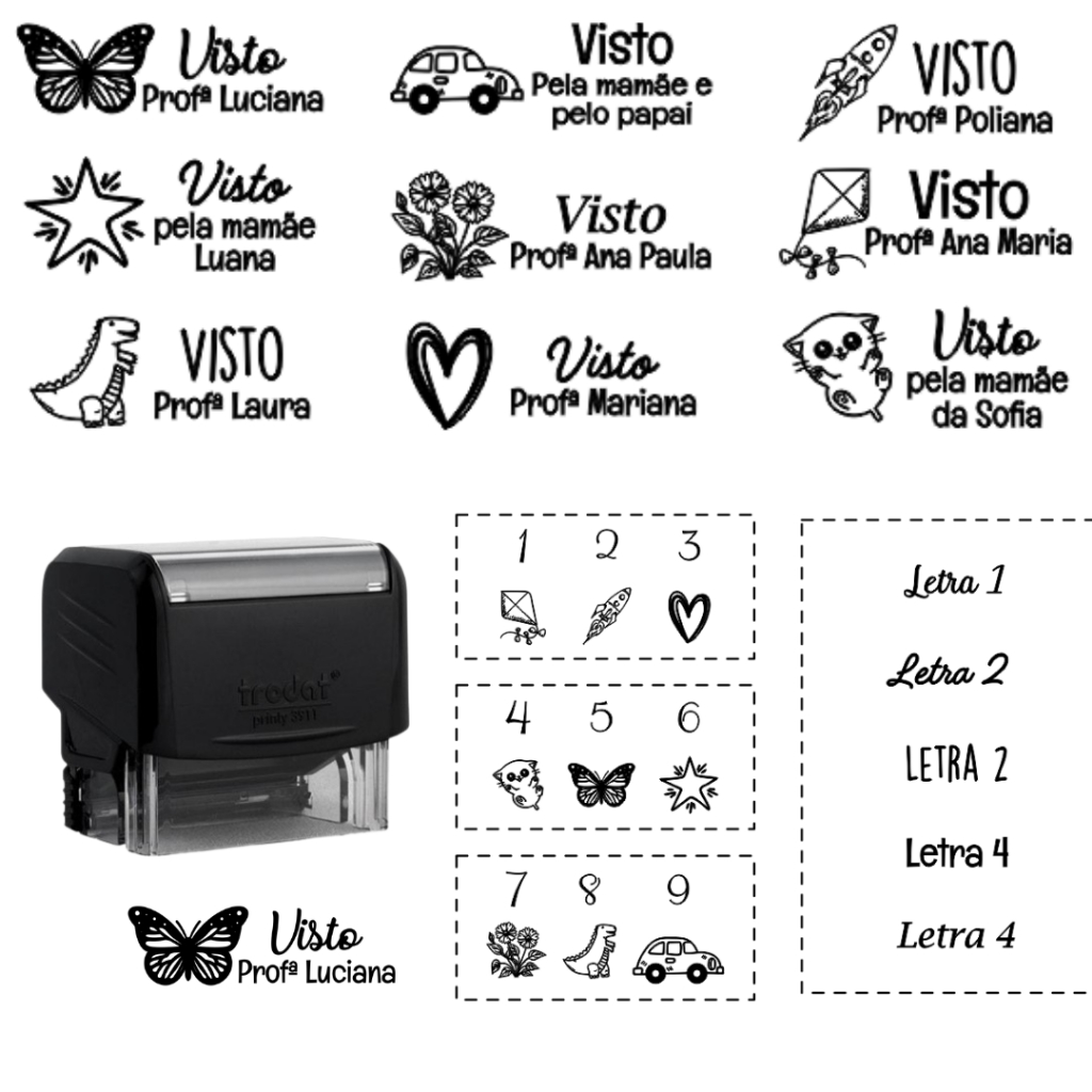 Carimbo Personalizado Visto pela mamãe, visto pelo papai, visto pela professora, cadernos, agendas, nome próprio