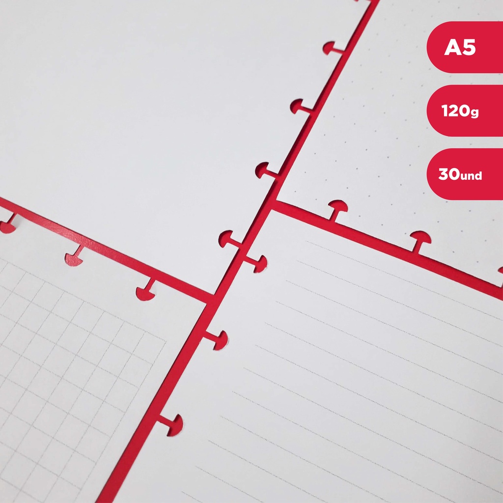 refil / miolo /folhas reposcionaveis a5 , 120g c/30 fls folhas soltas , para caderno de discos / caderno inteligente - furo inteligente - cogumelo