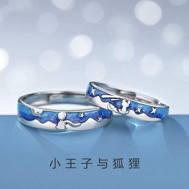 S925 Silver Cute Little Prince e Fox Couple Ring Abertura Ajustável Simples e Único Anel de Casal Feminino