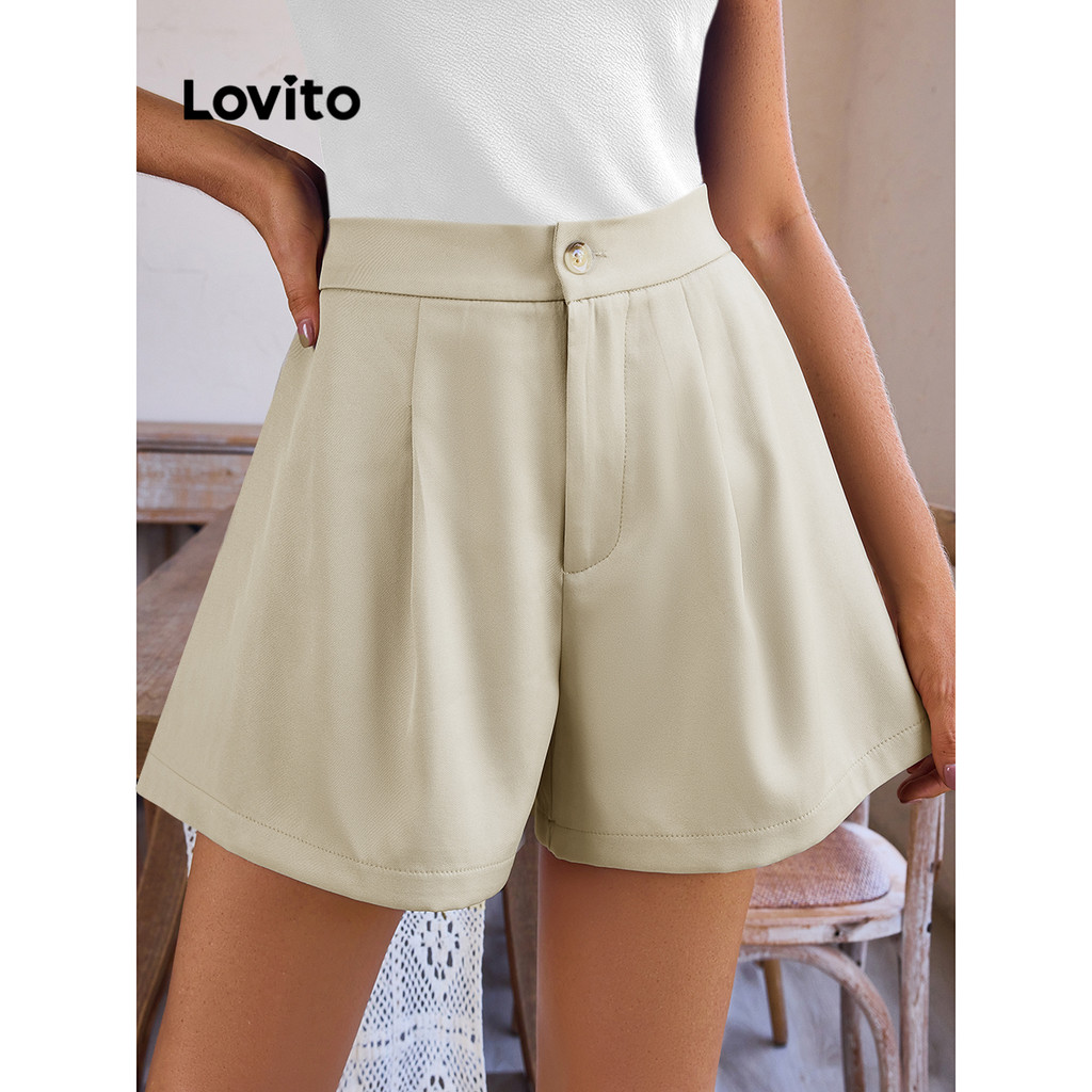 Lovito Shorts Plissados Casuais Com Botões Lisos Para Mulheres LNE49374