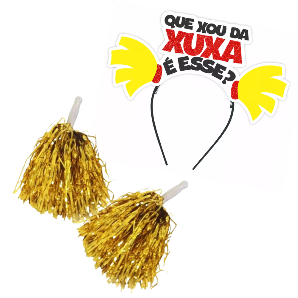 Tiara de Carnaval Xou da Xuxa e Pompom Dourado, Kit com 3 peças, Frase Que Xou da Xuxa é Esse