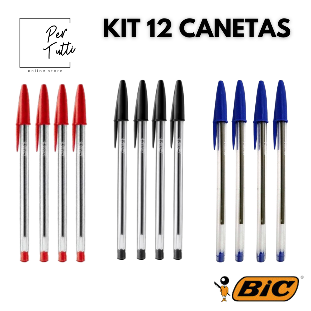 Kit 12 Canetas BIC - azul, preta e vermelha - Esferográfica 1,0mm - Ponta Média